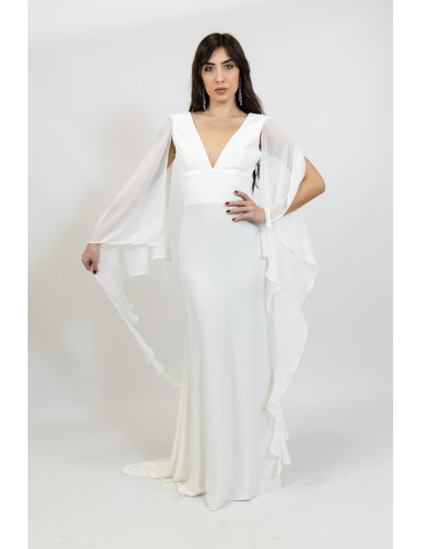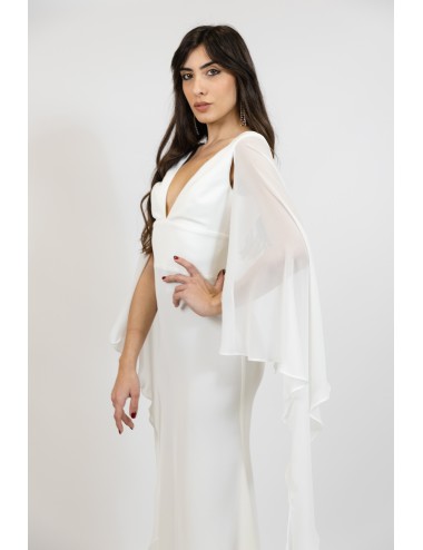 Etereo e candido. Questo long dress è caratterizzato da una profonda scollatura anteriore e fluttuanti maniche in georgette. Il taglio della gonna è a sirena e presenta una leggera coda posteriore mentre il punto vita è risaltato da un bustino che fascia il torace fin sotto al seno.