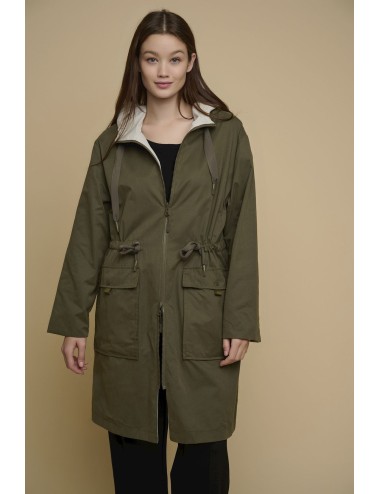 Cappotto lungo reversibile. Questo cappotto può essere indossato in due modi in modo da poter scegliere quale lato ti si addice meglio. Il cappotto presenta una chiusura frontale con cerniera, due tasche frontali con chiusura a bottone automatico e coulisse e ferma corda in vita e cappuccio. L'altro lato presenta due tasche laterali con chiusura a cerniera.